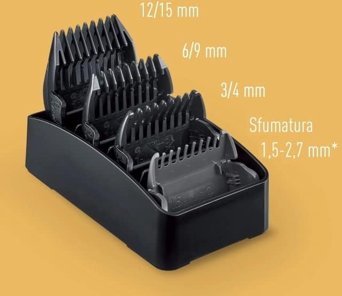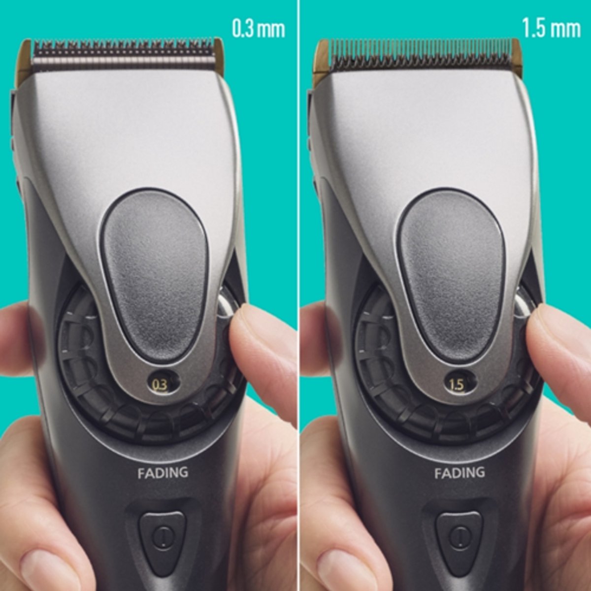 Pas de snijlengte moeiteloos aan met slechts één hand, via het gebruiksvriendelijke regelwiel. Kies uit vijf stabiele standen tussen 0,3 en 1,5 mm voor perfecte korte sneden. Met de bijgeleverde fading hulpstuk kun je nog fijnere overgangen creëren van 1,5 tot 2,7 mm. Daarnaast bevat de set drie opzetkammetjes voor zes verschillende lengtes van 3 tot 15 mm, waardoor je voor elke gewenste stijl de juiste instelling hebt.