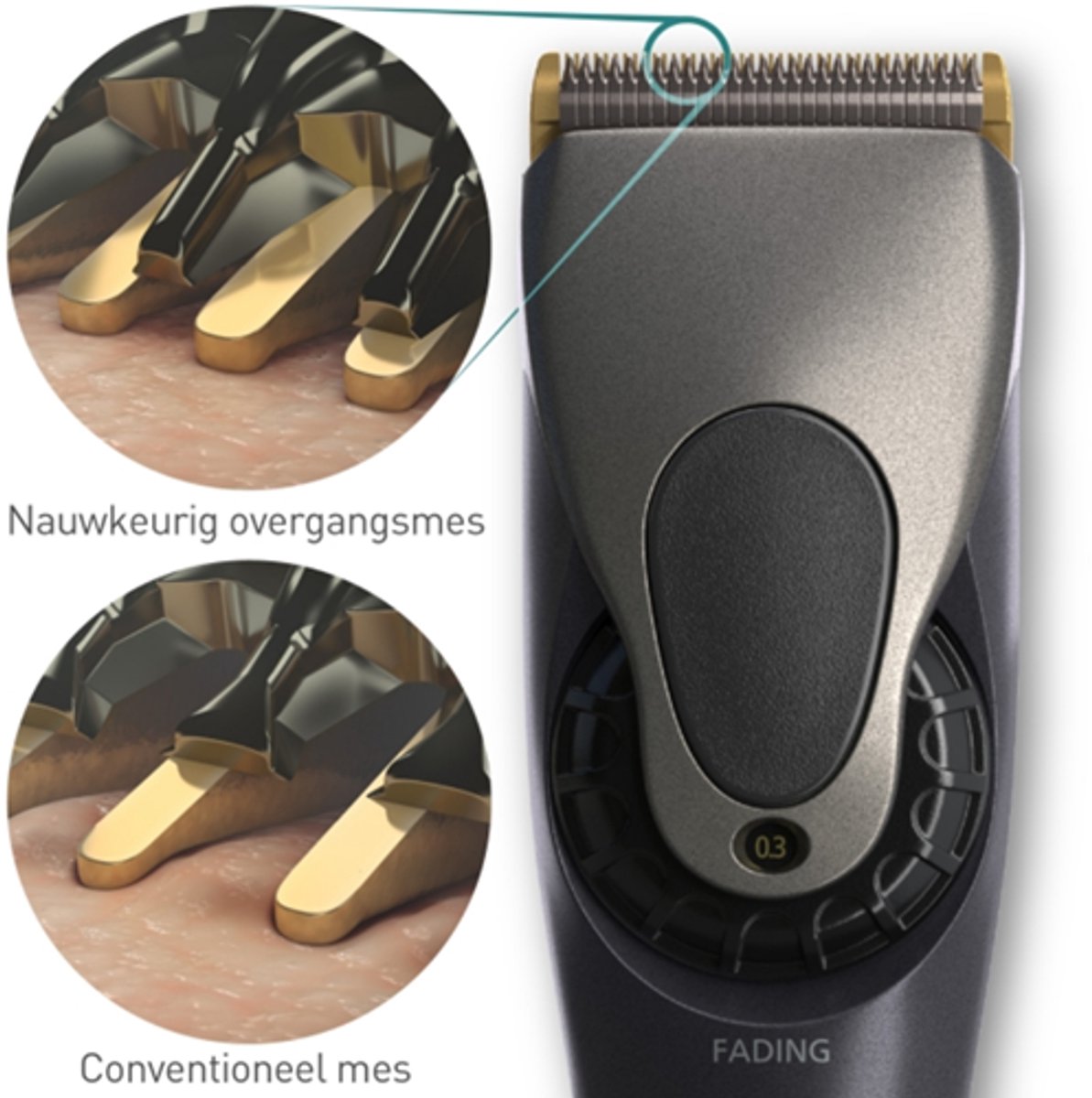 De precisieschaarkop is uitgerust met een koolstofvezel- en titanium coating, waardoor de messen uitzonderlijk scherp blijven en langer meegaan. Het scheerblad, met een breedte van 45 mm, wijkt slechts 0,3 mm af: perfect voor het realiseren van zeer korte kapsels en fade overgangen. Met de fijne tanden en de speciaal ontworpen vervagingsmes maak je moeiteloos vloeiende scheidingen en strakke lijnen.
